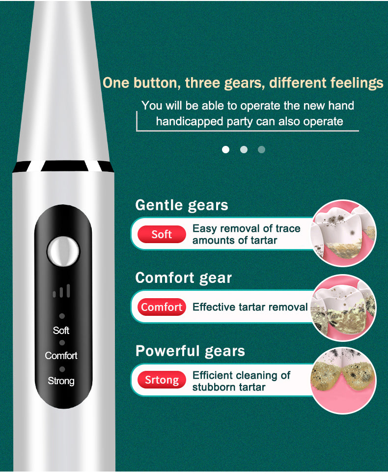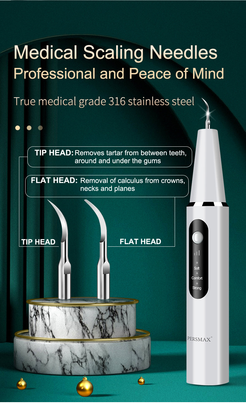 - 【3 Adjustable Modes】: PERSMAX Dental Calculus Remover offer Soft, Comfort, Strong, and 3 adjustable strength modes. Press the ring light button one time to switch the mode, suitable for the different sensitivity of gums and efficiently remove stubborn calculus, tartar, and tooth stains.